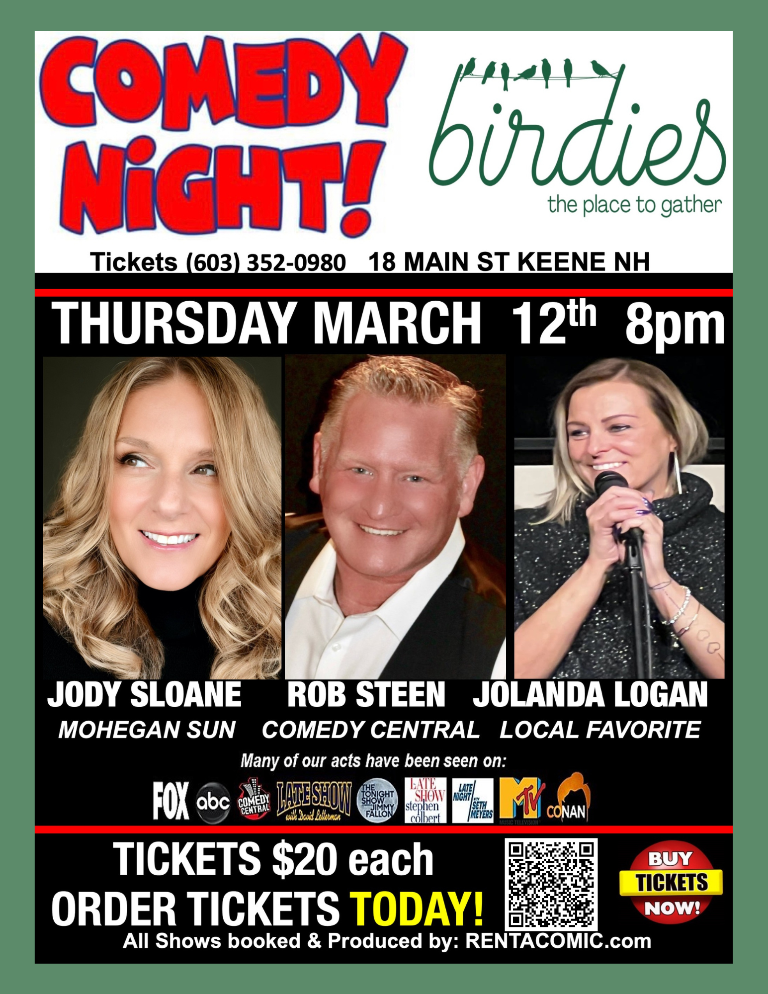 Join us Thursday March 12th for a night full of laughs with Birdies’ first comedy night! Featuring Jody Sloane, Rob Steen, and Jolanda Logan. Doors open at 7pm, and show starts at 8pm. This event is 18+.