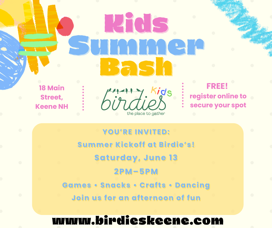 Kids Summer Bash! Saturday, June 13, 2026 2:00 PM 5:00 PM Google Calendar ICS Join us at Birdie’s on June 13 from 2–5PM for games, snacks, crafts, and dancing! This event is free to the public, but please register ahead of time to save your spot! Buy Tickets on Eventbrite Buy Tickets