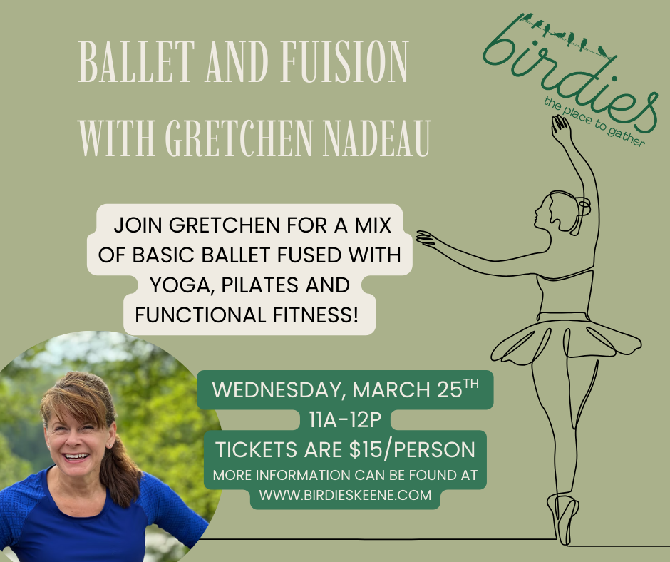 Join Gretchen for a mix of basic ballet fused with yoga, pilates, and functional fitness!