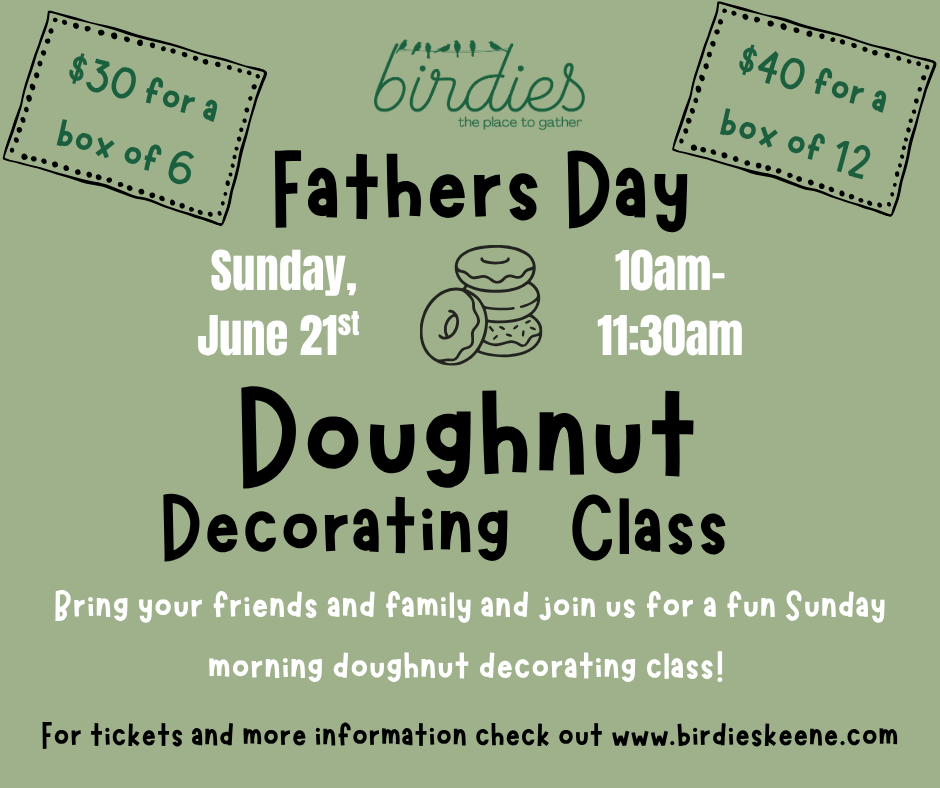 Back to All Events Father's Day Doughnut Decorating! Sunday, June 21, 2026 10:00 AM 11:30 AM Google Calendar ICS Celebrate Father’s Day with frosting, fun, and family time at Birdie’s! Our decorating workshop is the perfect way to create something sweet together. All supplies included. $30 for a box of 6, and $40 for a box of 12! Buy Tickets on Eventbrite Buy Tickets