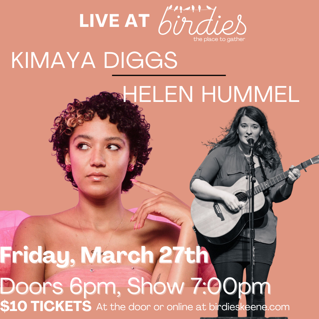 Two phenomenal singer-songwriters are coming to Birdies! Doors open at 6pm, Helen Hummel opens at 7pm, and then Kimaya Diggs after that. Food and drinks available to purchase. Get your tickets below!