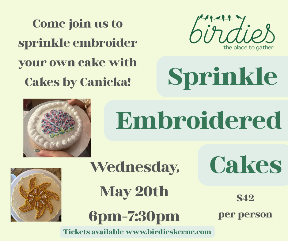 Join us Wednesday, May 20th for another fun-filled class with Canicka! This time, we’re creating stunning sprinkle embroidered cakes!