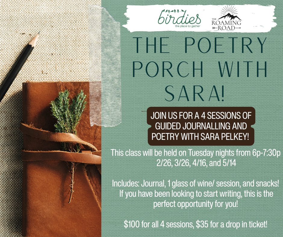Join us for 4 sessions of guided journaling and poetry with Sara Pelkey! Ticket includes a journal, 1 glass of wine per session, and snacks! If you have been looking to start writing, this is the perfect opportunity for you. This class will be held on the following days: February 22nd, March 26th, April 16th, and May 14th. Sign up for all 4 sessions for $100, or individual session drop-ins for $35.