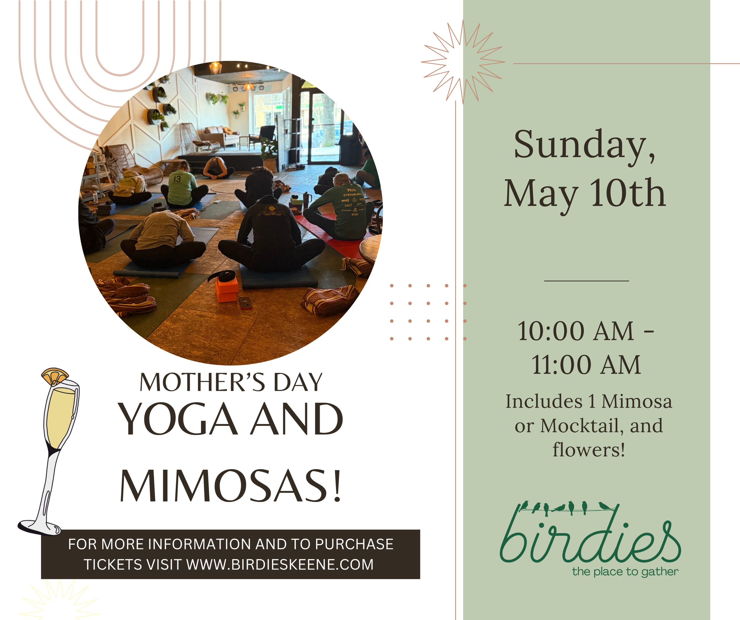 Back to All Events Yoga and Mimosas- Mother's Day! Sunday, May 10, 2026 10:00 AM 11:00 AM Google Calendar ICS Join us for our yoga and mimosas class with Katelynn! For this special Mother’s Day class, all tickets are $22 and include flowers, as well as your choice of mimosa or mocktail. Buy Tickets on Eventbrite Buy Tickets